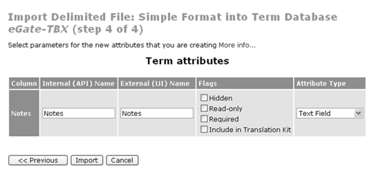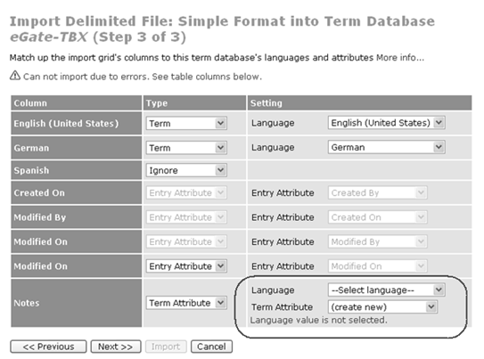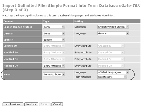 - Each column corresponds to either a WorldServer locale or a term entry attribute, depending on choices made before importing.
