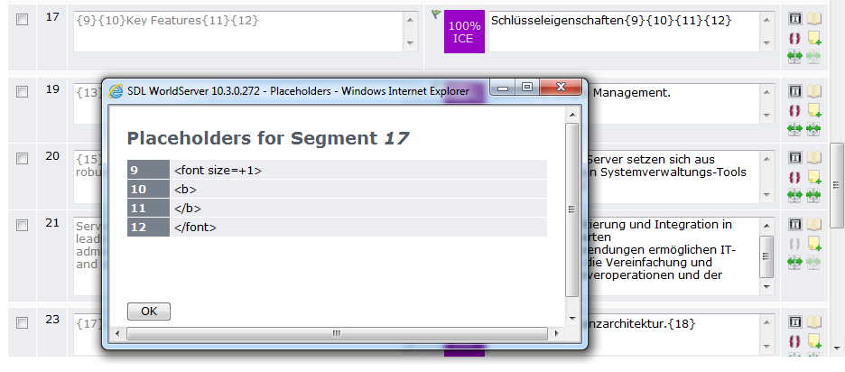 A placeholder is a visual representation of a piece of embeddable markup. Rather than exposing the actual markup to the translator, a placeholder is used to indicate the position of the markup within the segment. This ensures that translators cannot alter the content of the embeddable markup. Instead, translators are only allowed to position each placeholder in the target text in the correct location for the translation. WorldServer requires that all placeholders that are in the source text also appear in the target text.