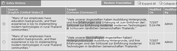 If you want to restore a previous version of the entry, perhaps because you accidentally replaced a more appropriate translation, you can select the translation that you want to restore, then click the Restore Translation button. Clicking this button restores the entry to the state you select, and adds the restored translation to the top of the history list, with changes from the previous translation highlighted.