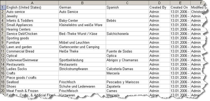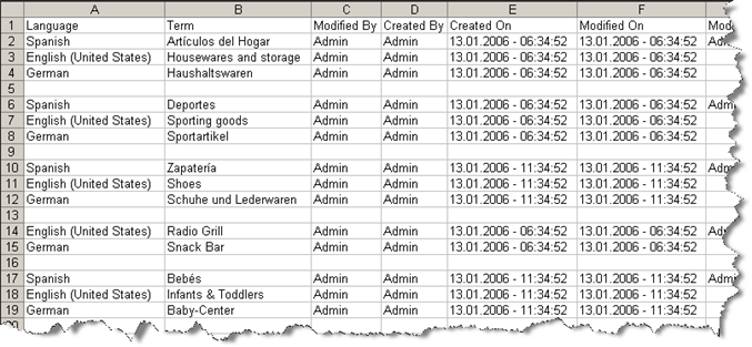 In Advanced format, each row contains a locale instance (that is, one term) for an entry, with columns for the language, the term, and each attribute. An entry therefore is comprised of multiple rows, one for each term in the entry.