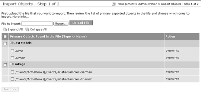 Action column indicates that the object already exists in that WorldServer instance and that you will overwrite the existing object if you import it again.