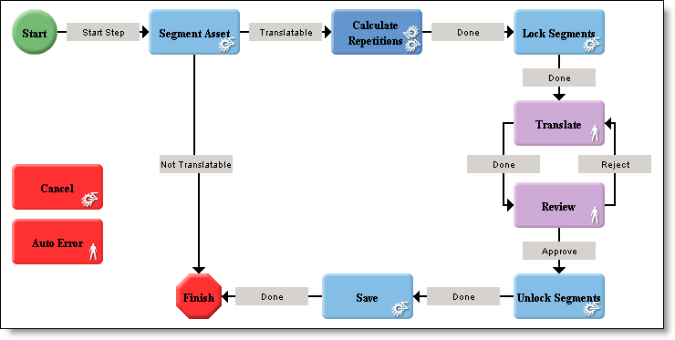 The following workflow adds a Lock Segments automatic action, which prevents translators from changing certain segments. For example, if a segment has already been translated and approved, you might want to prevent further changes to the segment. The Lock Segments action either locks all segments or in-context matched (ICE) segments only.